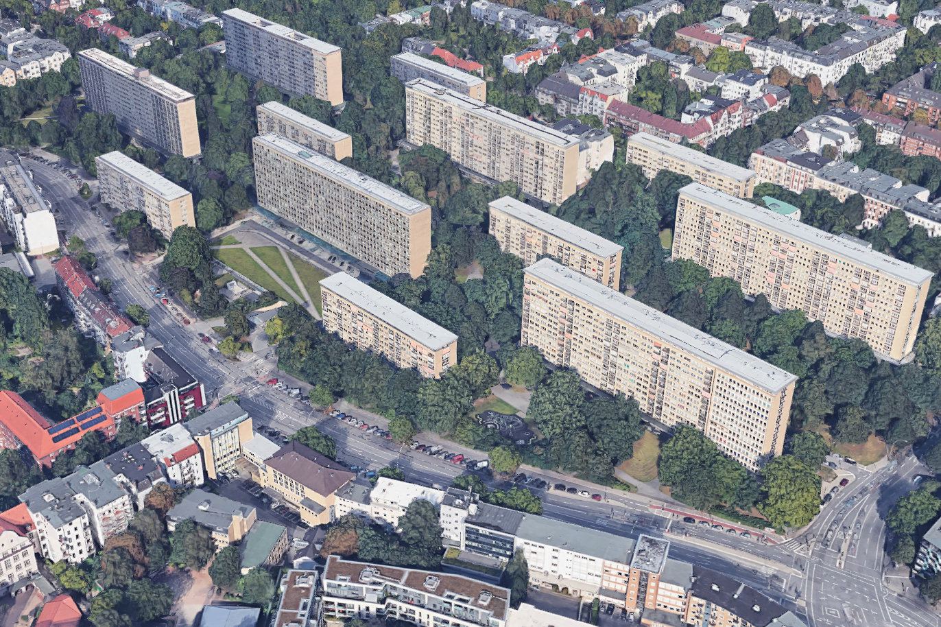 Die Grindelhochhäuser. Quelle: Bilder © 2017 Google, Kartendaten © GeoBasis-DE/BKG (©2009), Google