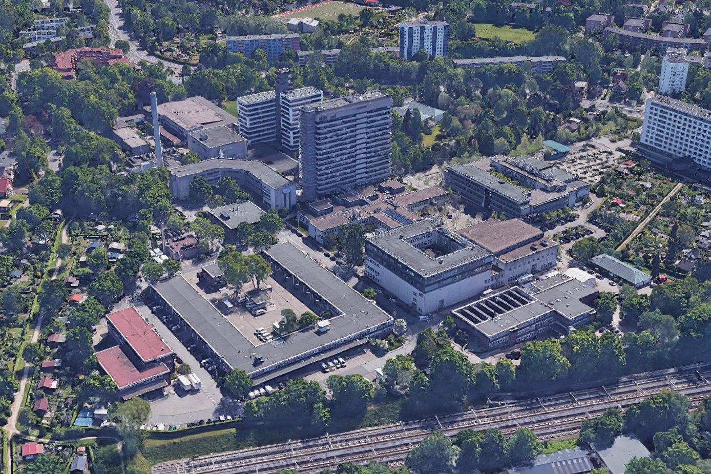 Der alte Wasserturm in Stellingen, umgeben von Kleingartenanlagen. Quelle: Bilder © 2017 Google, Kartendaten © GeoBasis-DE/BKG (©2009), Google