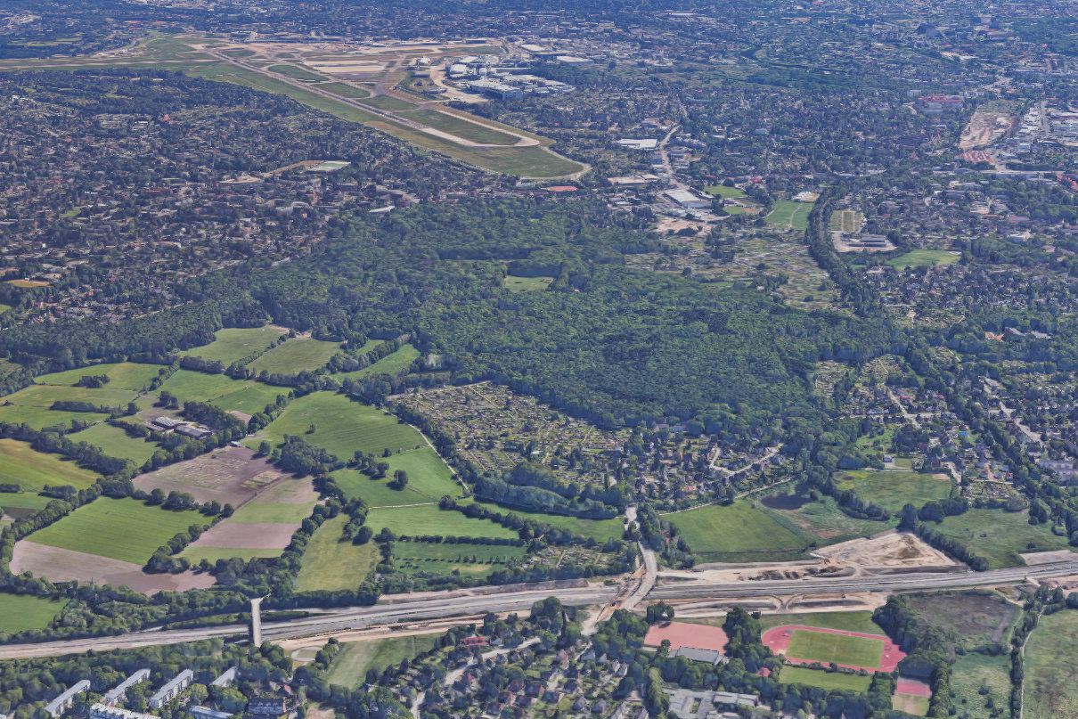 Das Niendorfer Gehege und der Flughafen Hamburg. Quelle: Bilder © 2017 Google, Kartendaten © GeoBasis-DE/BKG (©2009), Google