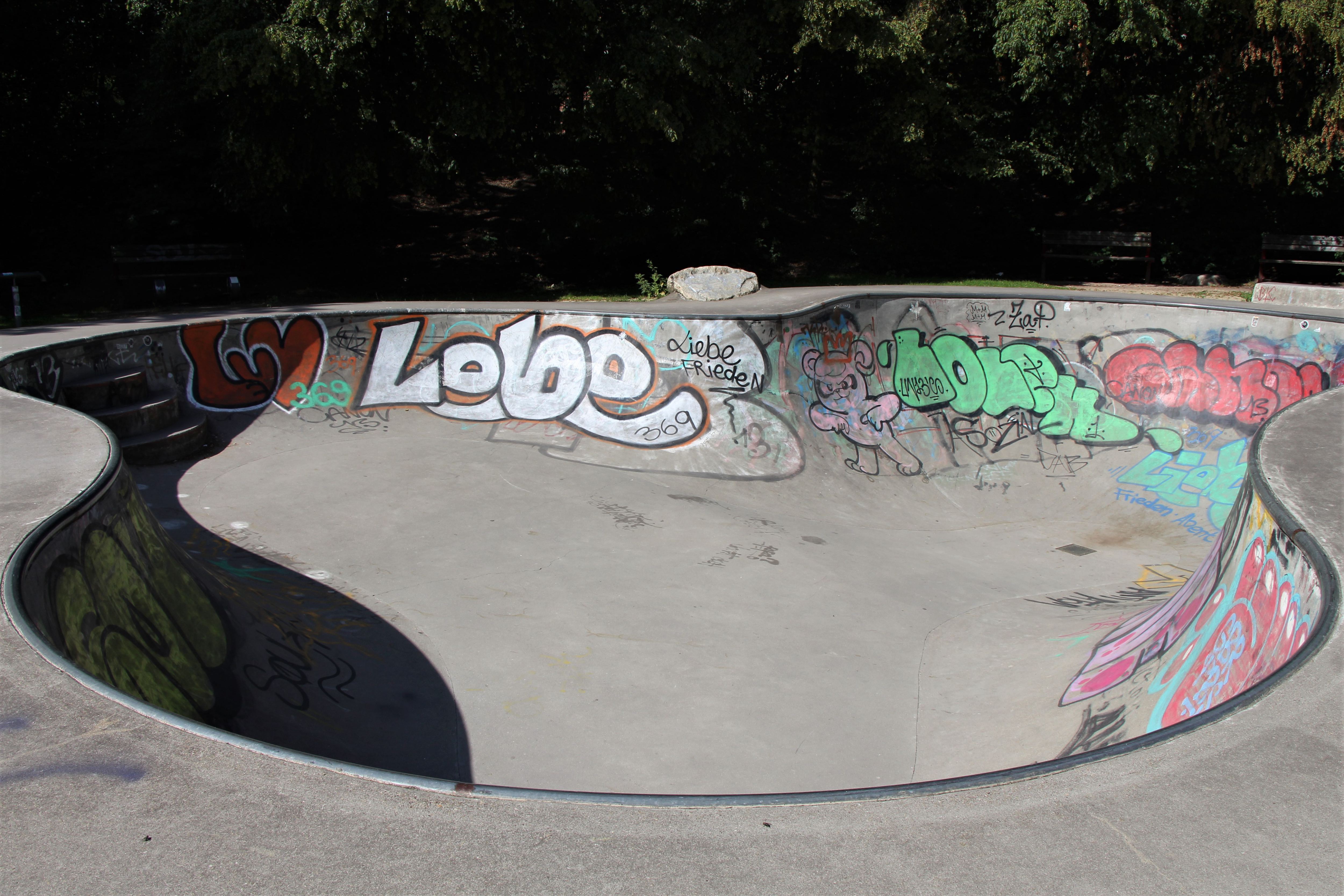 Von Catharina RudschiesWie eine übergroße, kleeblättrig geformte Pfütze liegt im Wehbers Park unweit der Emilienstraße etwas versteckt hinter Hecken ein Pool. Graffiti unterschiedlicher Couleur und Qualität ziehen sich über die Innenwände des Beckens, das aussieht wie ein verlassener Swimming Pool. Der Unterschied: Wasser ist in diesem Pool unerwünscht. Hier zeigen Skater ihre Tricks und ihr Können.