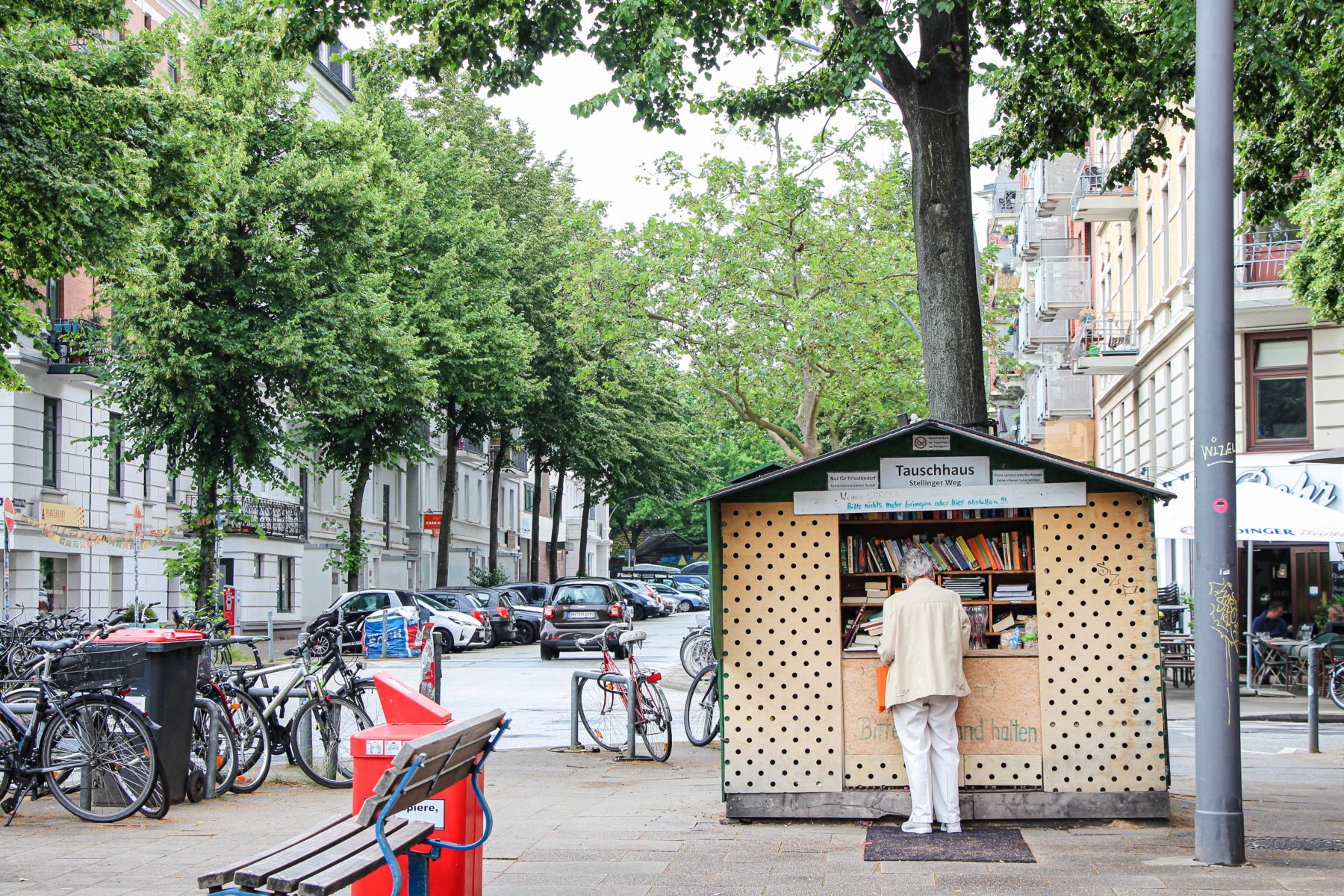 Das Tauschhaus an der Kreuzung zwischen Stellinger Weg und Schopstraße ist in den letzten Jahren ein Treffpunkt geworden. Längst nicht mehr nur zum Tauschen von Gebrauchtem, sondern auch zum nachbarschaftlichen Zusammenkommen bei einem Feierabendbier. Es ist ein heißer Julitag, die Mittagssonne beginnt zu brennen. Vor dem Tauschhaus sonnen sich Menschen auf den Bänken, einer liegt auf dem Lüftungsschacht der U-Bahn.