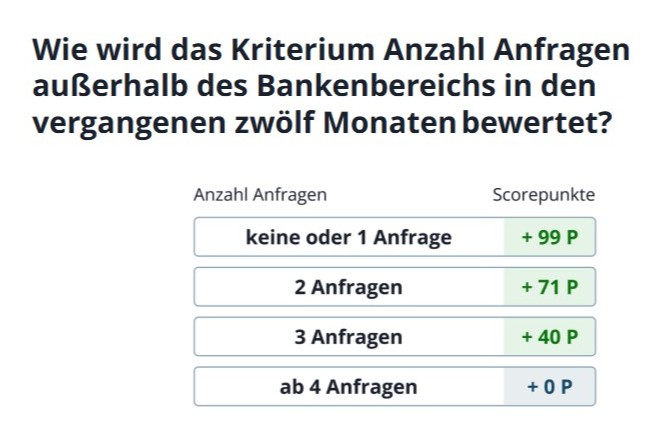 Eine einzelne Anfrage verschlechtere den Wert nicht. Zwei Anfragen können dazu führen, dass der Score um 28 Punkte sinkt. Ab vier Anfragen sinke er um 99 Punkte – ein Zehntel des Maximalwerts.